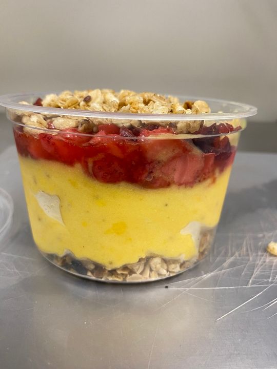 Base: Passion Fruit On Top: Banana, Strawberry, Sunflower Seeds, Cranberries, Granola