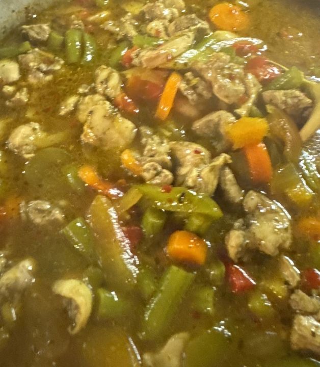 Jerk Chicken, Onions, Peppers, Carrots, Green Beans, Butternut Squash, Pumpkin base, herbs & spices
