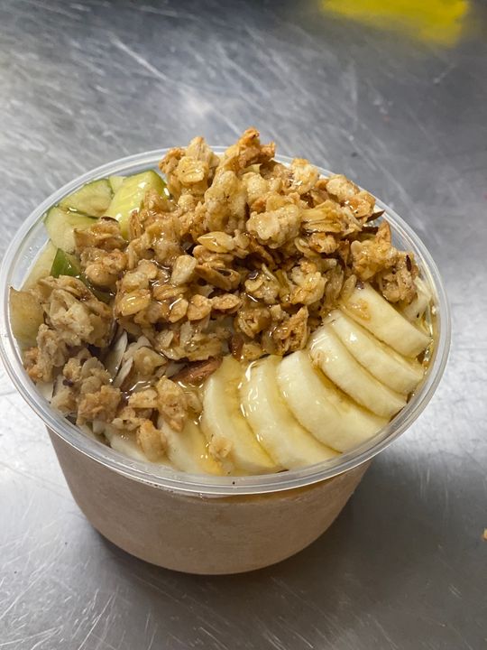 Matcha Base topped with gluten free granola, agave drizzle, banana, pineapple and chiaseed
