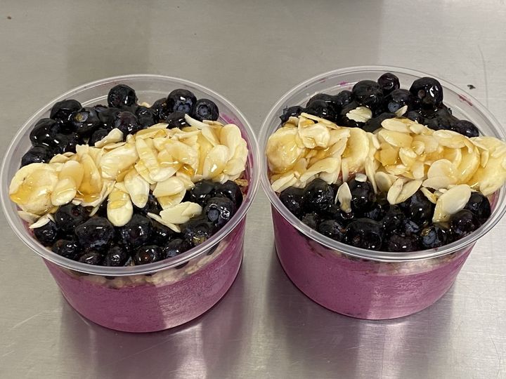 Pitaya Base topped with Blueberries, Banana, Almond slice, Granola, Honey Drizzle