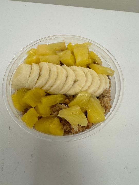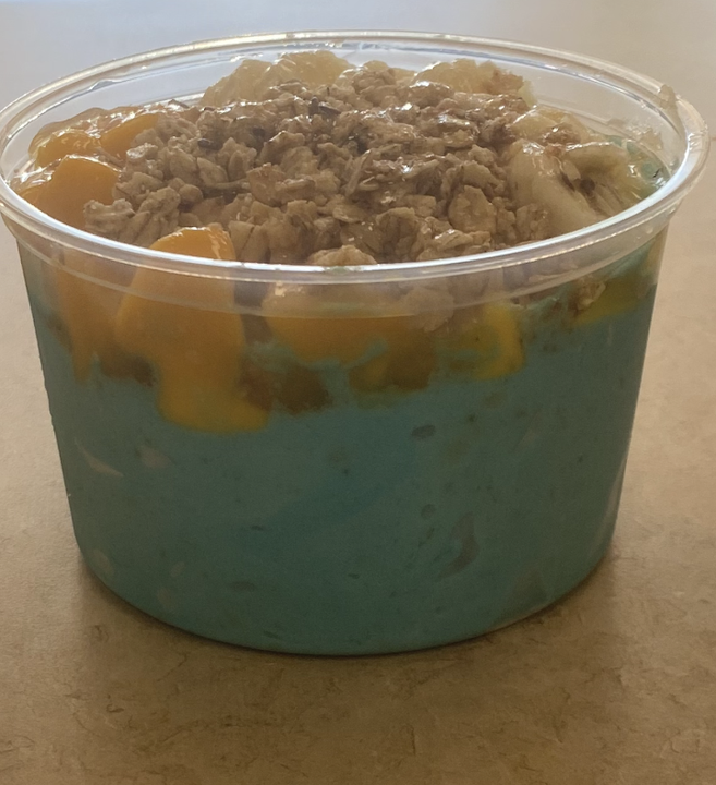 coconut base w/blue spirulina topped with banana, pineapple cubes, mango, coconut granola and agave drizzle