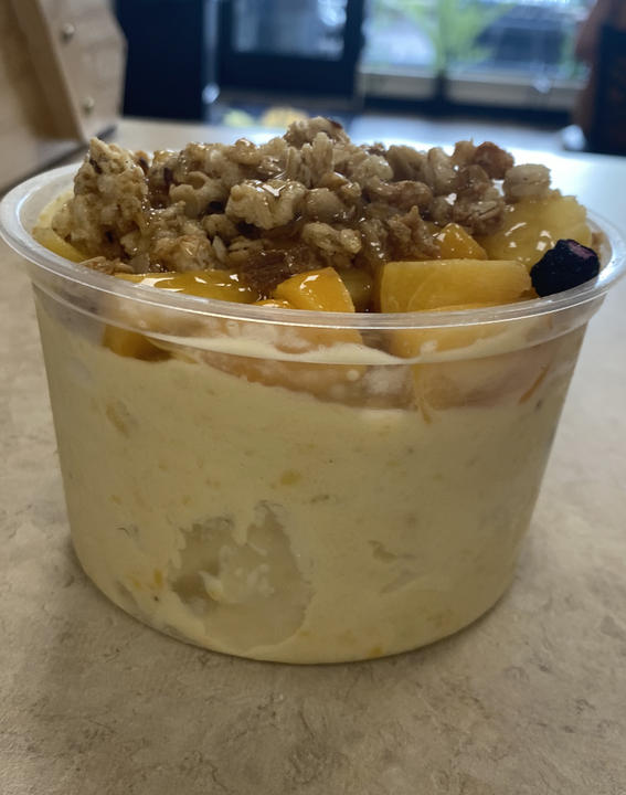 Peachy base topped with coconut granola, coconut chips, honey drizzle, peaches, banana