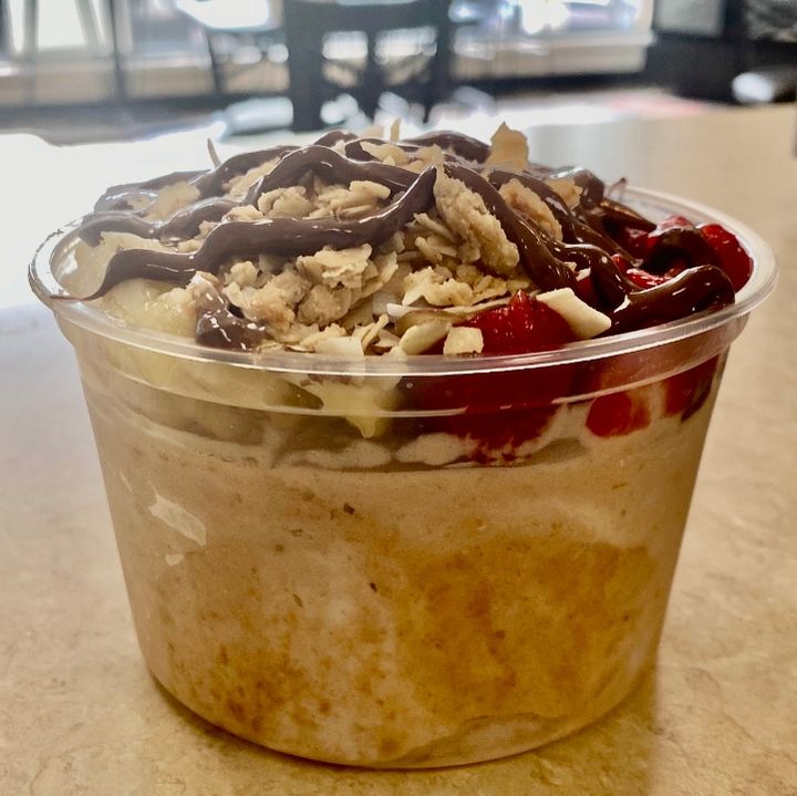 Cacao Base - topped with banana, strawberry, coconut chips, almonds, coconut granola, nutella and agave drizzle
